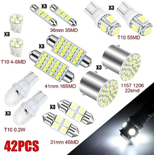 【LED Light Set】: The package contains 42 pieces of interior LED lights in 7 different types, 6 pieces for each type, including T10 0.2W Map LEDs, T10 5SMD LEDS, 1157 1206 225MD, T10 4-SMD LEDs, 36mm 3SMD LEDS, 41mm 165MD LEDS, 31mm 4SMD LEDS to meet your using and replacing needs on car interior lights.